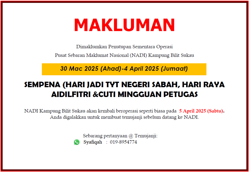 Dimaklumkan bahawa Mini NADI Kampung Bilit Sukau akan ditutup sementara bermula 30 Mac 2025 (Ahad) hingga 4 April 2025 (Jumaat) sempena: